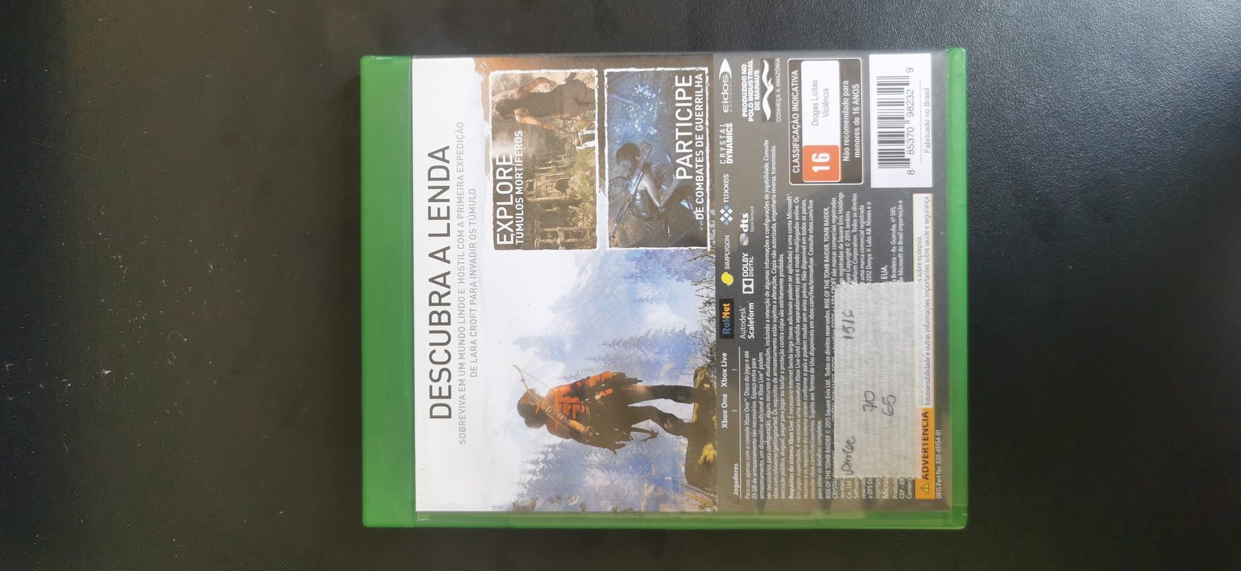 Tomb Raider, conhecido como Lara Croft: Tomb Raider de 2001 a 2008, é uma franquia de mídia que se originou de uma série de jogos eletrônicos de ação e aventura criada pela desenvolvedora britânica Core Design. A franquia é atualmente propriedade da CDE Entertainment; anteriormente, pertencia à Eidos Interactive e, posteriormente, à Square Enix Europe após a aquisição da Eidos pela Square Enix em 2009, até que o Embracer Group adquiriu a propriedade intelectual juntamente com a Eidos em 2022. A franquia foca na arqueóloga britânica fictícia Lara Croft, que viaja pelo mundo em busca de artefatos perdidos e se infiltra em tumbas e ruínas perigosas. A jogabilidade geralmente se concentra em exploração, resolução de quebra-cabeças, navegação em ambientes hostis repletos de armadilhas e combate a inimigos. Mídias adicionais foram desenvolvidas para a franquia na forma de adaptações cinematográficas, histórias em quadrinhos e romances. Rise of the Tomb Raider para Xbox One em midia fisica. Produto usado em bom estado, original e testado antes do envio. Fotos reais do item cadastrado na loja e envio rapido para todo o Brasil.
